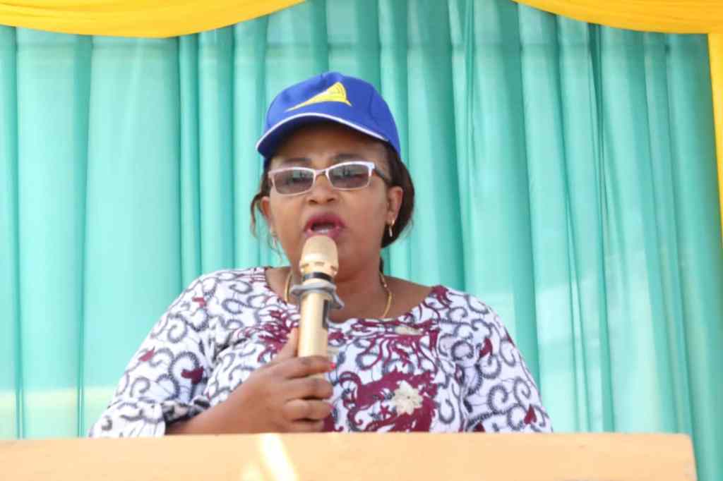 Mkuu wa Mkoa wa Singida Mhe. Halima Dendego akiongea na watumishi wa umma Mkoa wa Singida katika kituo cha mabasi Ikungi kwenye maadhimisho ya siku ya wafanyakazi duniani.
