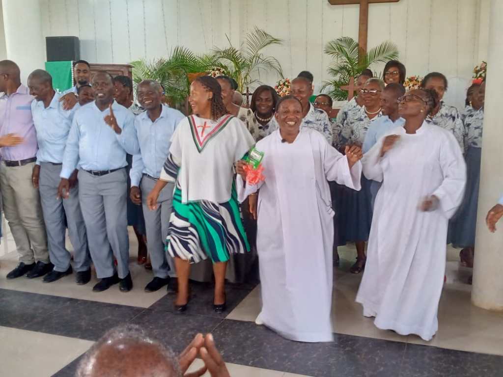 Mwinjilisti Kiongozi wa Mtaa wa Kwembe, Emeline Mzava na Mtendakazi Anna Mauki pamoja na wanakwaya wa kwaya hiyo wakifurahia jambo wakati wa uzinduzi wa Albamu ya kwanza ya Kwaya Kuu ya Mtaa huo Siku ya Jumapili, (Picha na Vincent Mpepo).