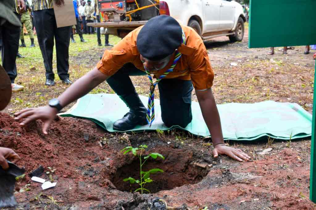 Kiongozi wa mbio za Mwenge wa Uhuru kitaifa Ismail Ali Ussi akipanda mti kama ishara ya kutunza mazingira na uboreshaji wa nishati ya jua katika Hospital ya Mchukwi.