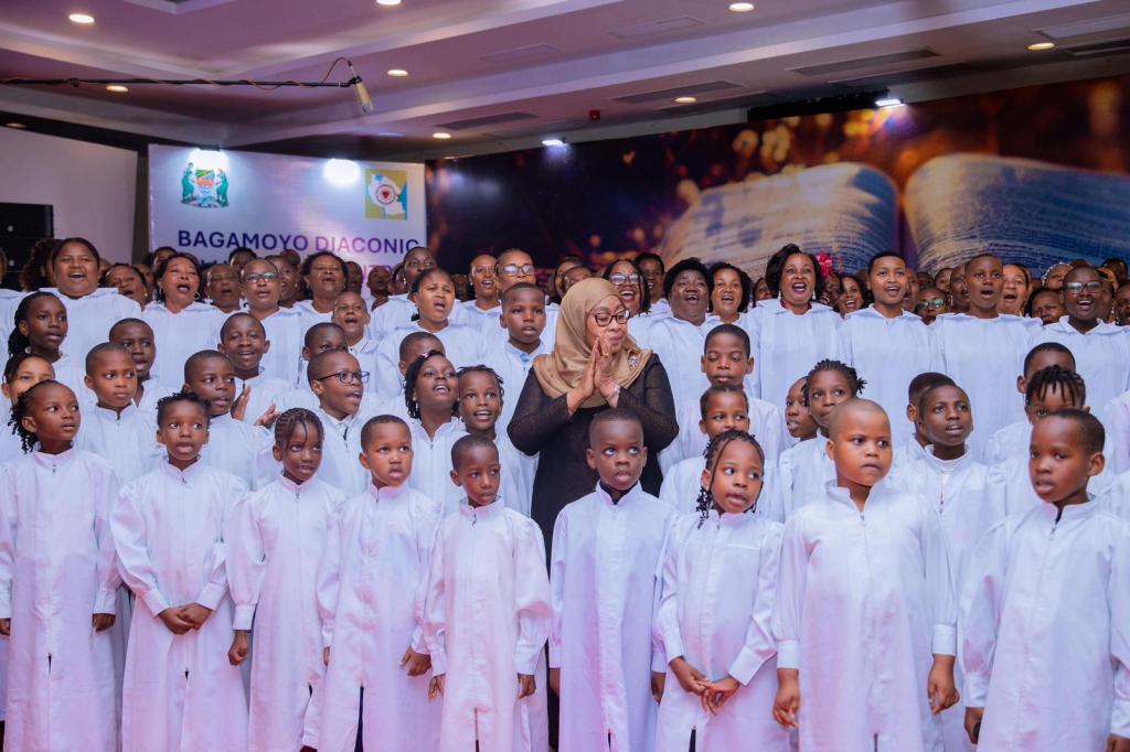 Rais wa Jamhuri ya Muungano wa Tanzania, Mhe. Dkt. Samia Suluhu Hassan akiwa na Kwaya Kuu ya Kanisa la Kiinjili la Kilutheri Tanzania (KKKT)-Kimara wakati ikiimba kwenye Harambee ya kuchangia ujenzi wa Kituo cha watoto wenye mahitaji maalum cha Bagamoyo Diaconic Lutheran Centre iliyofanyika Leo kwenye ukumbi wa Diamond Jubilee Jijini Dar es Salaam.Kituo hicho kinahamishwa kutoka maeneo ya Kijichi Dar es salaam amabko kwa sasa kuna changamoto za kimazingira kwenda Kitopeni Bagamoyo na kwamba kukamilika kwa kituo hicho kutasaidia watoto wengi zaidi kupata huduma.