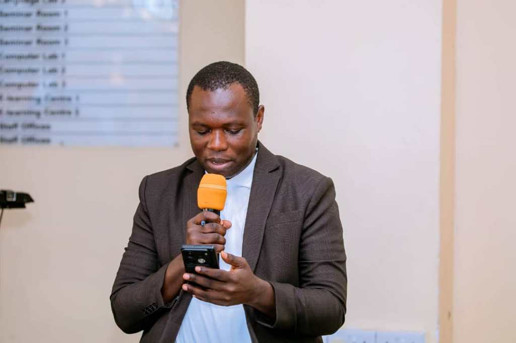 Mkuu wa Kitengo cha Mawasiliano na Masoko cha Chuo Kikuu Huria cha Tanzania, Dkt. Adam Namamba akisoma jumbe za wafanyakazi kutoka vituo vya mikoa nje ya Dar es salaam walioshiriki Mkutano wa Makamu Mkuu wa Chuo na wafanyakazi uliofanyika jana Kinondoni, jijini Dar es salaam. (Picha kwa hisani ya Kitengo Cha Mawasiliano na Masoko, Chuo Kikuu Huria cha Tanzania).